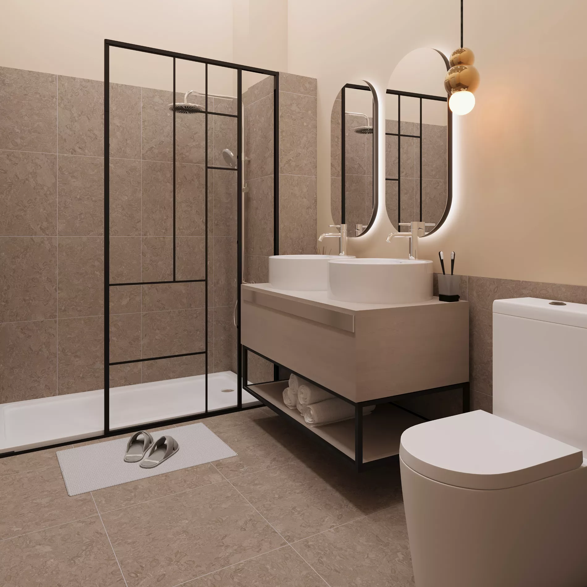 The master bedroom features a walk-in closet and an exclusive en suite bathroom with a shower. Additionally, there is a guest bedroom with its own en suite bathroom.