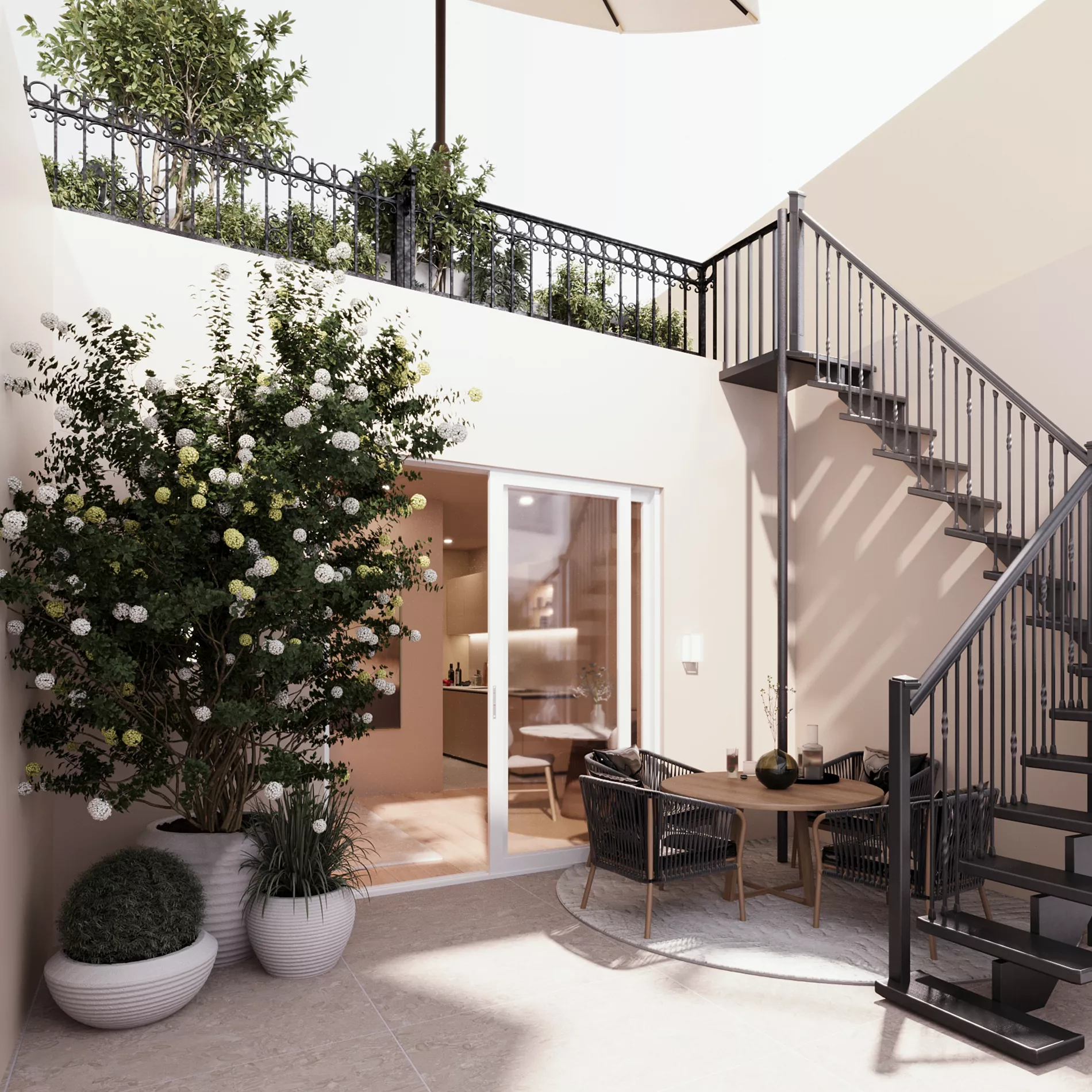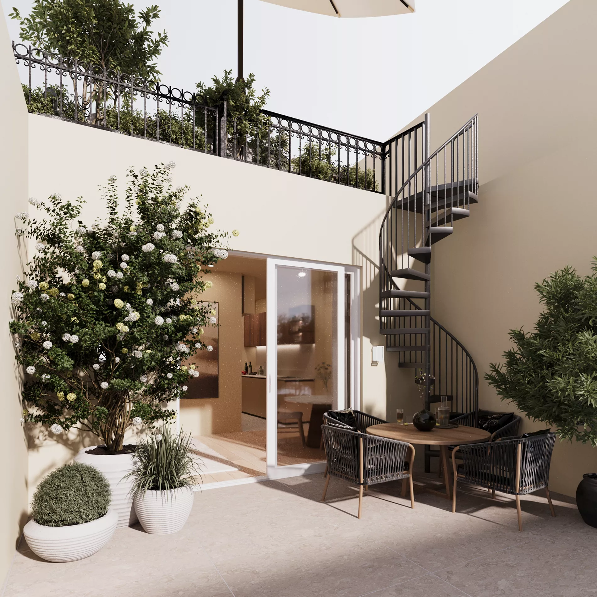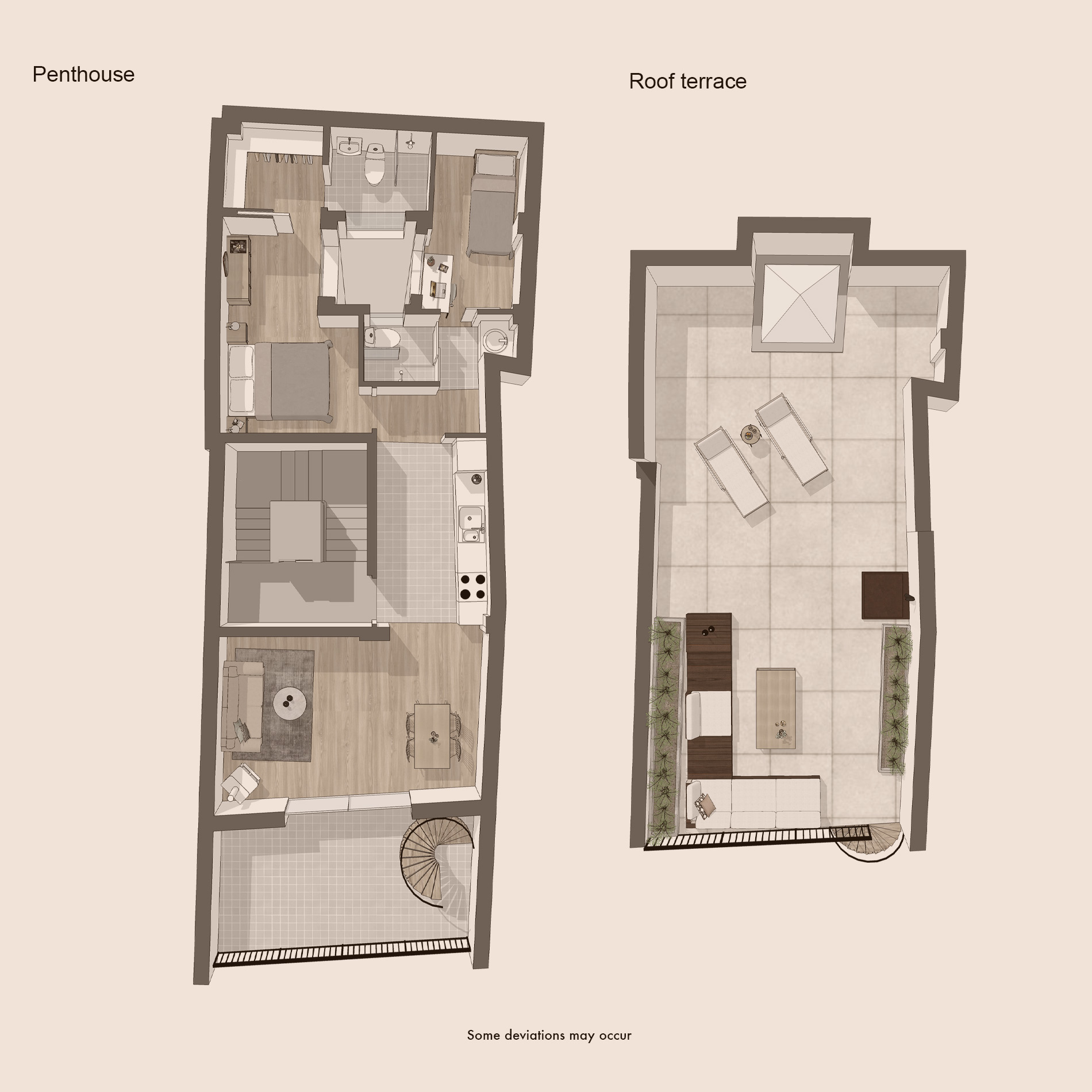 The penthouse is adorned with exclusive furnishings, showcasing quality material choices and abundant natural light. The living room is enhanced by a large sliding door opening to an inviting terrace, as well as a welcoming fireplace. Above the terrace lies the stunning roof terrace, offering panoramic views of Cartagena Old Town. The roof terrace presents an opportunity to craft your personal haven, whether adorned with greenery, sun loungers, or even a rooftop bar.